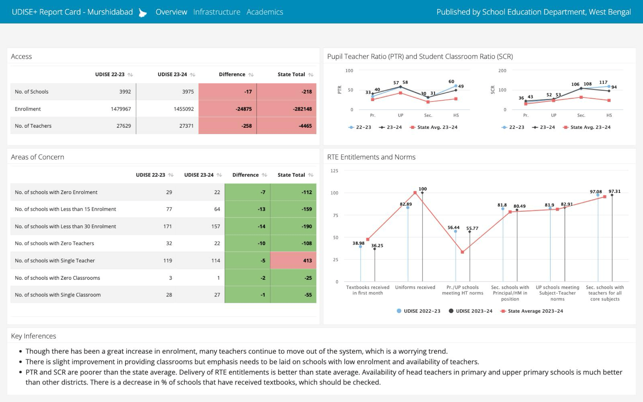 As a result, the state education department adopted standardised reporting formats and routines that were used for regular programme reviews, district performance discussions, and internal planning. These systems supported the production of district report cards and state-level briefs that were routinely shared with senior officials, reducing ad-hoc data requests and improving alignment between administrative data and planning processes.